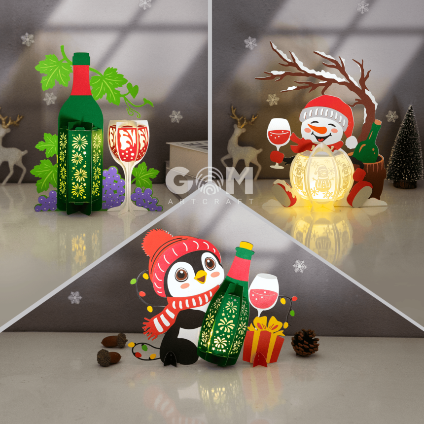 Snowman Lantern, Penguin Lantern, Christmas Wine Bottle Lantern, Happy New Year Lantern SVG, Paper Cut Template For Christmas