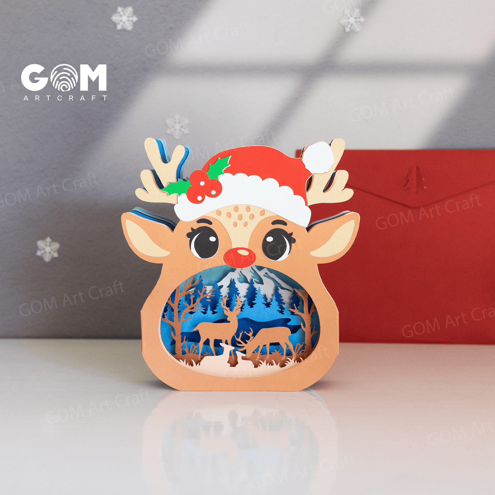 Reindeer Pop-up Card 3D, DIY Pop-up Card Christmas Ornaments SVG, 3D Christmas Papercut Card, Reindeer Paper Cut Template For Christmas, GOMArtCraft