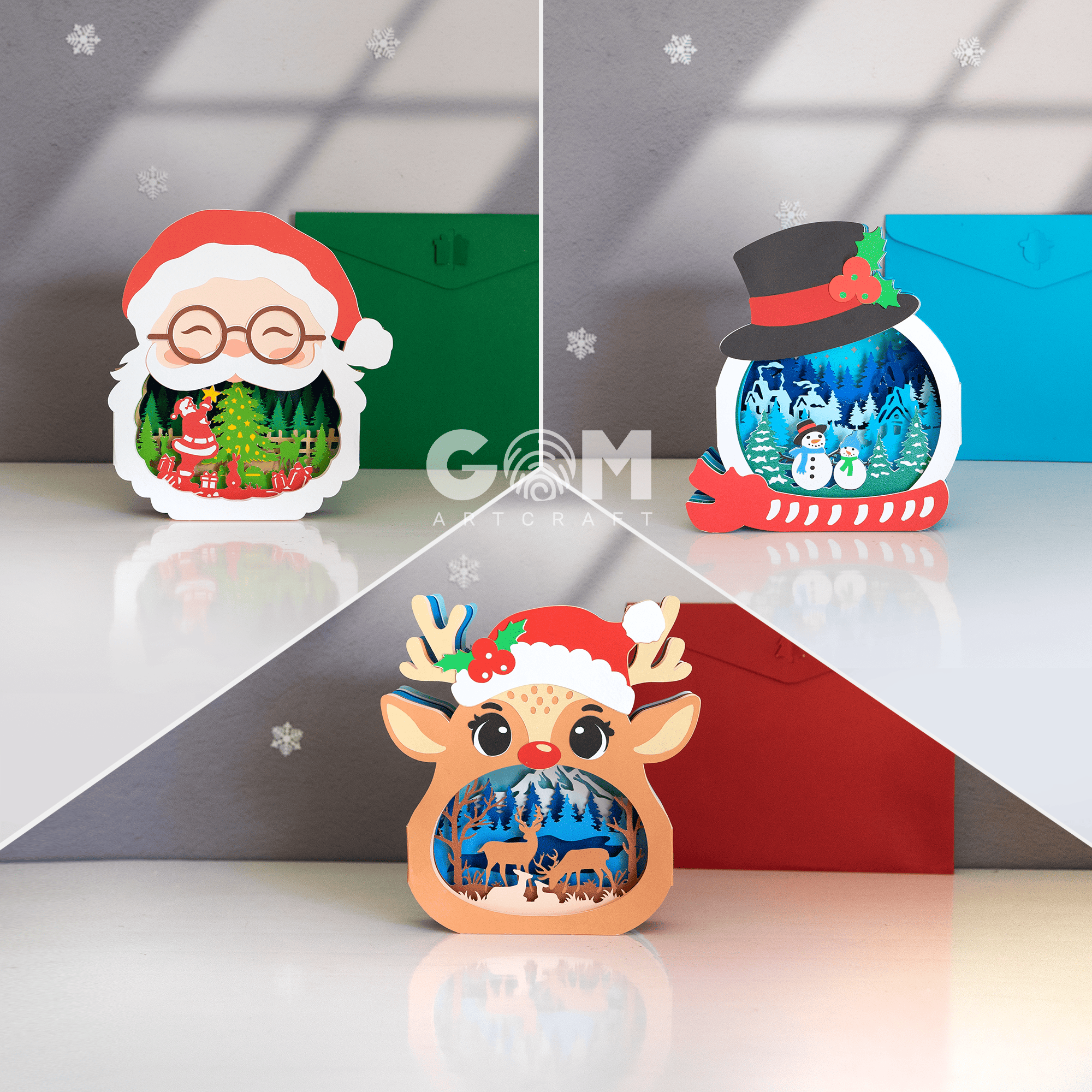 Set 3 Christmas Pop-up Card 3D, Santa Claus-Snowman-Reindeer Pop-up Card, DIY Pop-up Card Christmas Ornaments, 3D Christmas Papercut Card, GOMArtCraft