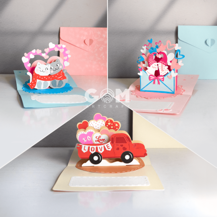 Set 3 Valentine’s Pop-up Card Template, Gnomes Love Pop-up Card, Cat Couple Card DIY, Car Love Card SVG GOMArtCraft